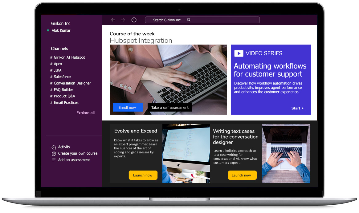 Integrate the knowledge base across the tools you work with in one place. Whether someone needs to revise a skill or learn something new, they just need to ask and Girikon.AI will redirect them to the right content.